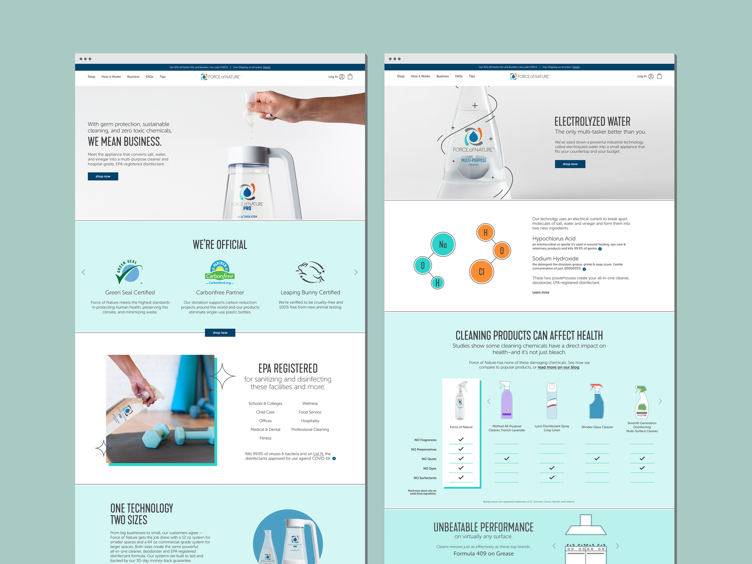Force of Nature is a non-toxic, antibacterial, environmentally-friendly, make-at-home cleaning solution—something that doesn’t exist in the consumer market and as such, requires some education to explain. Adding to that, historically it’s been difficult to differentiate in a very crowded market of so-called “natural” cleaning products.